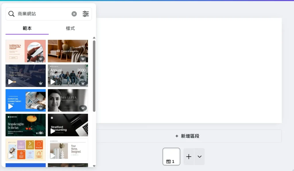 進入 Canva,搜尋「網站(Website)」範本,就能看到成百上千個設計。從個人作品集、活動邀請到品牌簡介,各種風格都有。選擇一個你覺得最符合需求的版型作為起點。