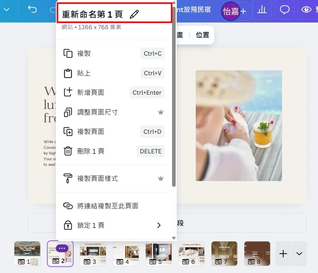 在中間底下頁面縮圖列點擊 「⋯」「編輯頁面選單名稱」,先把結構與命名建立好,後續編輯更省時。