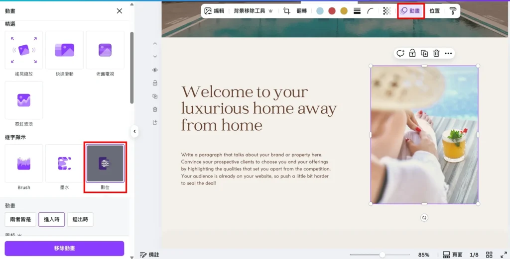 點選圖片(或元素),上方會出現功能列,點 「動畫」。左側將出現各種動畫特效,挑選喜歡的效果即可;若不喜歡,點選下方 「移除特效」
