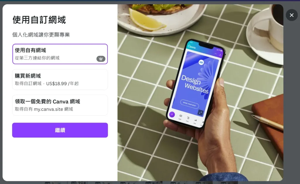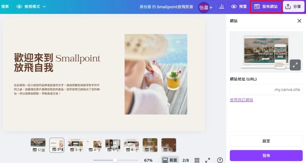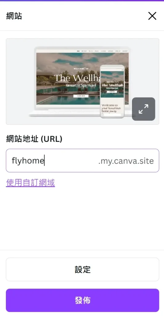 完成設計後,按下「發佈網站」。系統會自動產生一個 xxx.my.canva.site 的免費子網域,立即就能分享給客戶或朋友。如果是 Pro 方案,還能綁定自有網域,品牌感更完整。