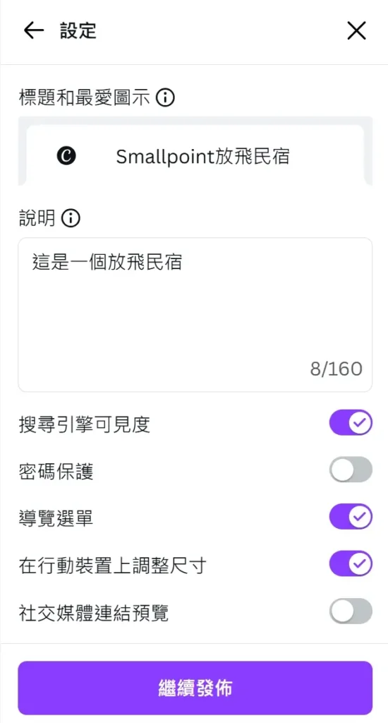 填寫網站名稱、描述、等資訊,讓訪客更了解你的網站以及打勾搜尋引擎能見度與社交媒體連結預覽。