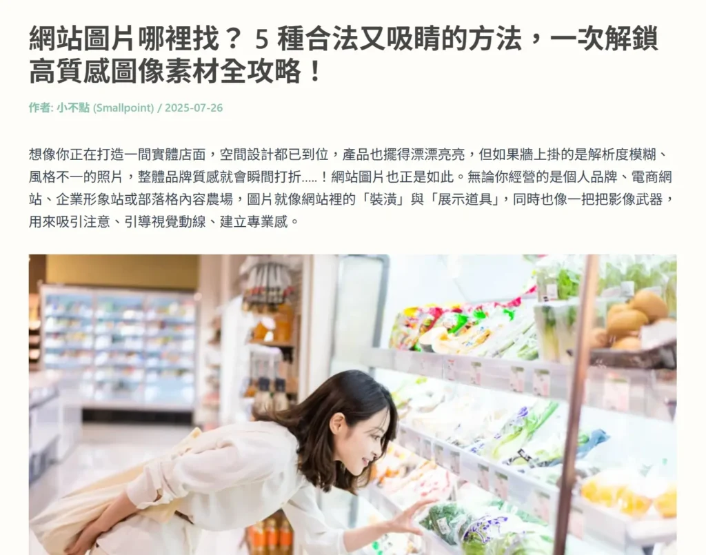 • 內文圖片:每頁 2–4 張,統一風格;先放 1200px 版本。