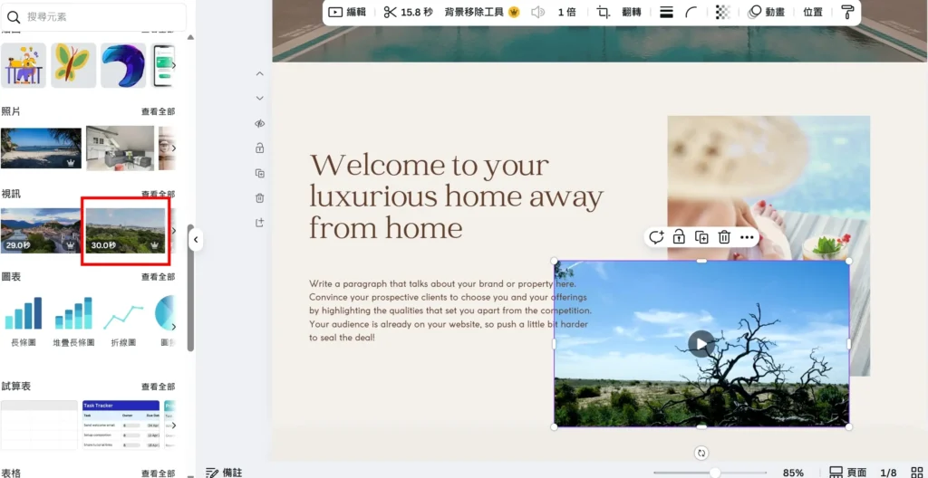 點選左側 「元素」,往下滑找到 「視訊」 區塊,將喜歡的影片拖拉至畫面中即可使用。