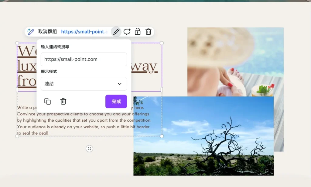Canva 採 區塊式 設計,對想加連結的 文字或圖片 連點兩下,會彈出 連結 介面;貼上連結網址後套用即可。