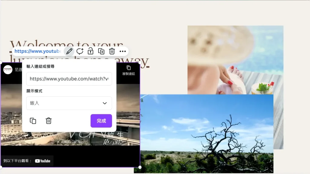 在連結介面切換為嵌入 YouTube 影片的畫面