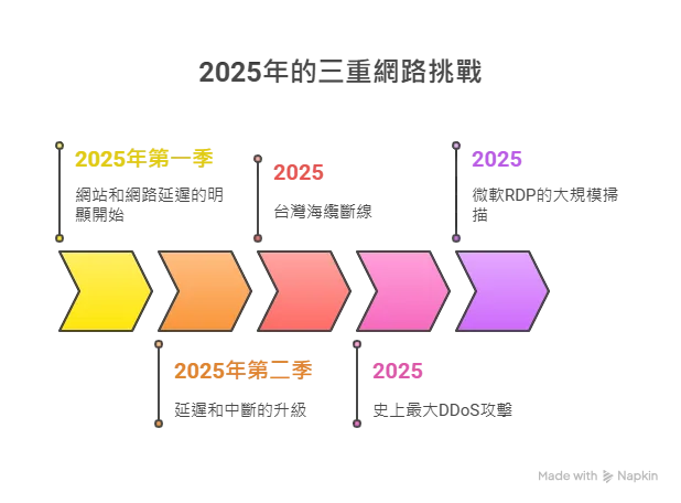 你有沒有感覺今年上網變慢了? 從第一季開始,直至現在的第二季,網站與網路延遲的情況愈來愈明顯。不只追劇、線上購物、瀏覽新聞,甚至連 Google Drive 上傳檔案、LINE 語音通話,或是 Zoom、Google Meet 等線上會議,都時常遇到卡頓。這不是你的手機或電腦壞掉,而是 2025 年全球網路正面臨一場「三重警訊」:台灣海纜斷線、史上最大 DDoS 攻擊,以及駭客對微軟 RDP 的大規模掃描。