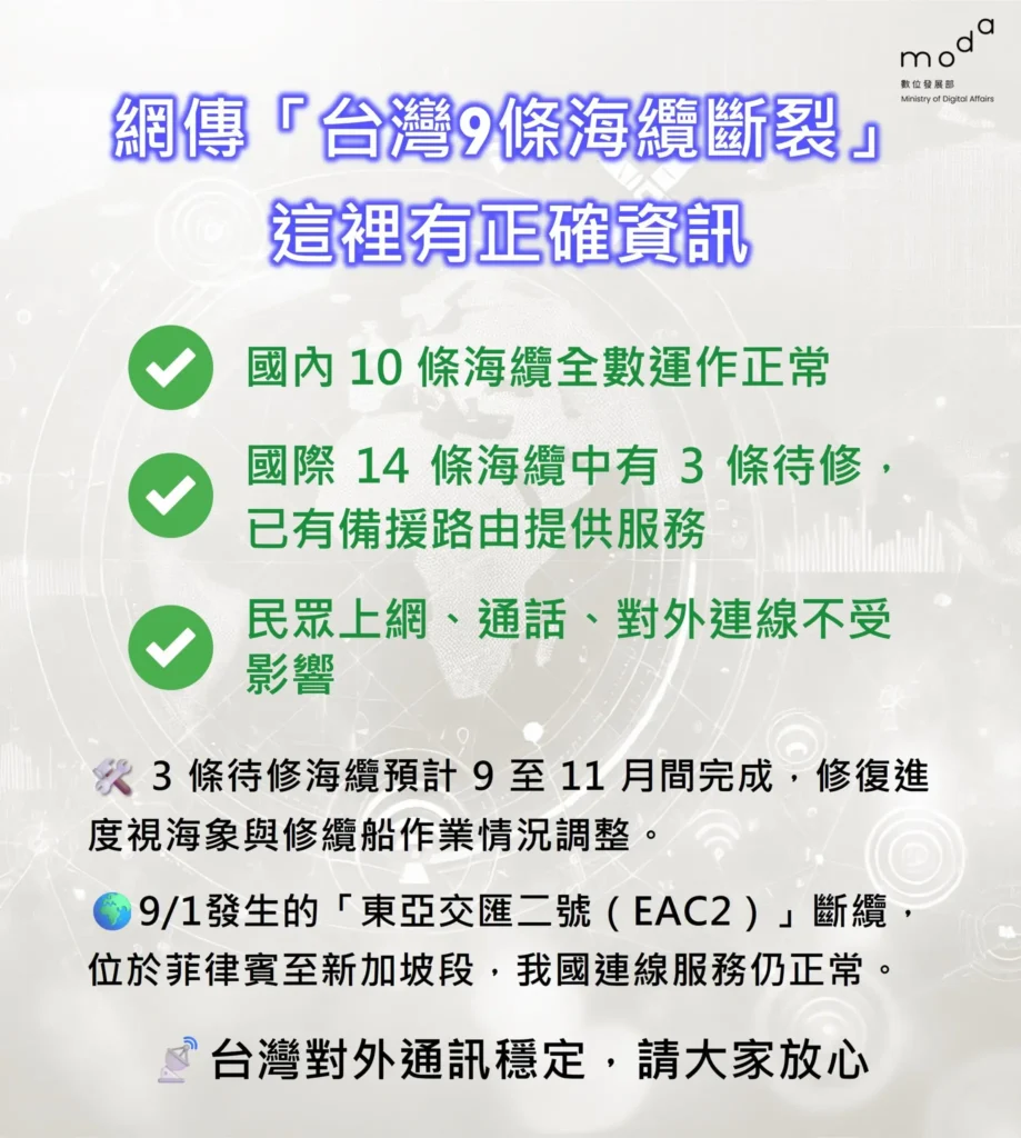 換句話說,雖然「9 條同時斷線」的說法誇大了現況,但多線同時出現事故,仍凸顯台灣在地緣風險下的脆弱性。