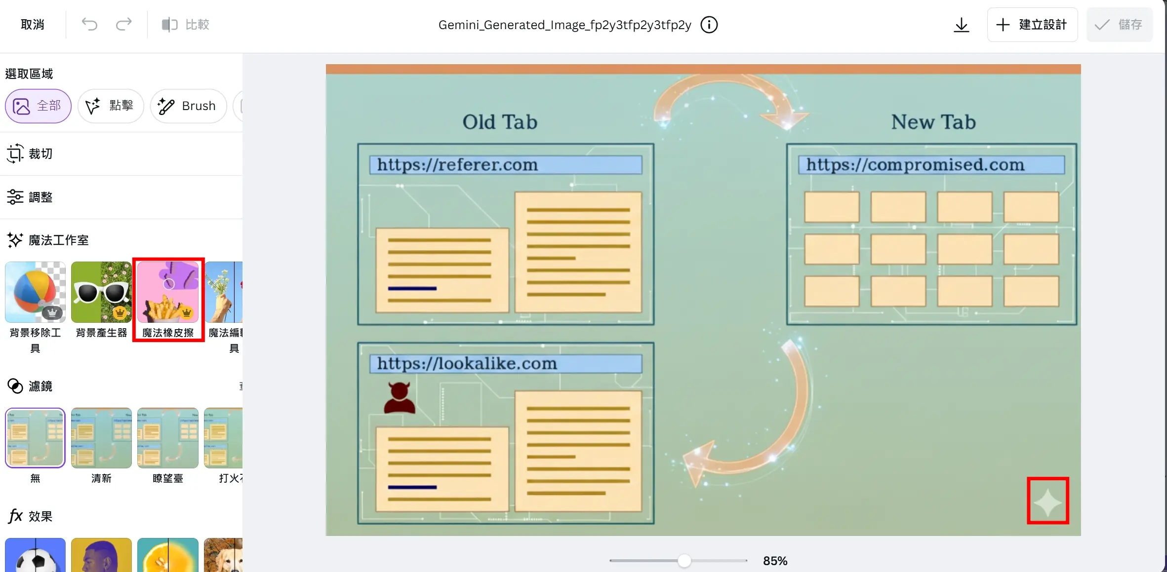 因此,即使你用 Canva 的魔法橡皮擦(Magic Eraser) 輕鬆修掉右下角的星號浮水印,