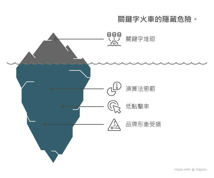 演算法會判斷這種「重複且不自然的排列」為 keyword stuffing(關鍵字堆砌),不但無法提升排名,反而有機會被視為低品質內容,影響整體網站的信任度。 -
